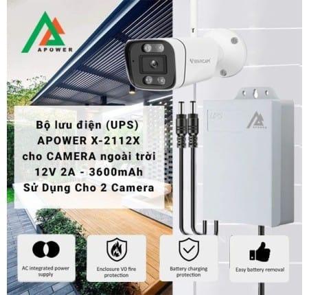 - DỰ PHÒNG AN TOÀN: Bộ lưu điện APOWER X-2112X 12V 2A, pin 3600mAh, duy trì hoạt động liên tục đến 7 giờ cho 2 camera.